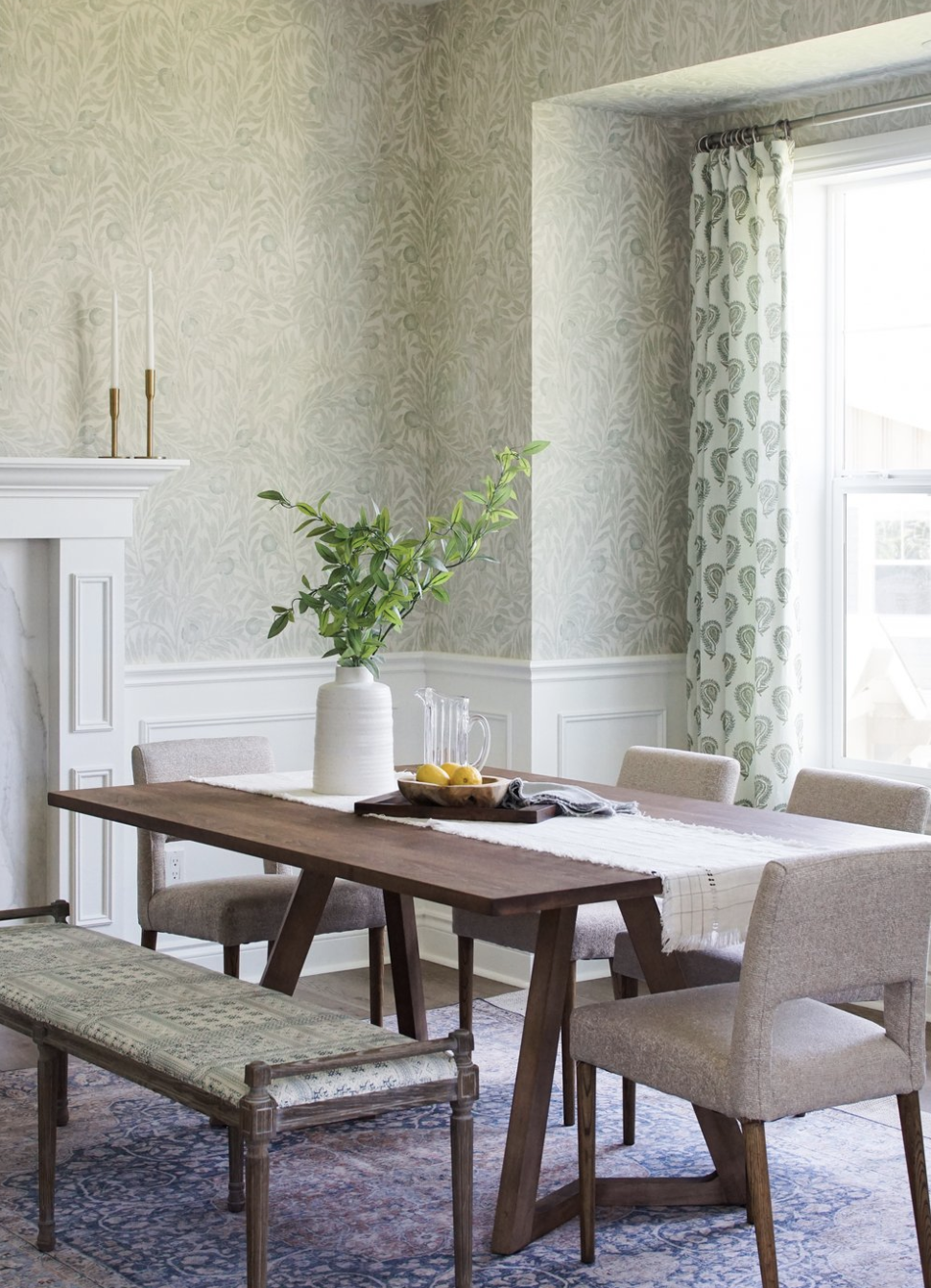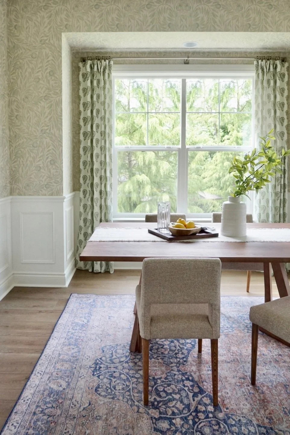 We paired the wallpaper with another print, for the drapery, in a similar tone. The wall molding along the lower half of the walls balances out the pattern on pattern look, adding dimension to the space.